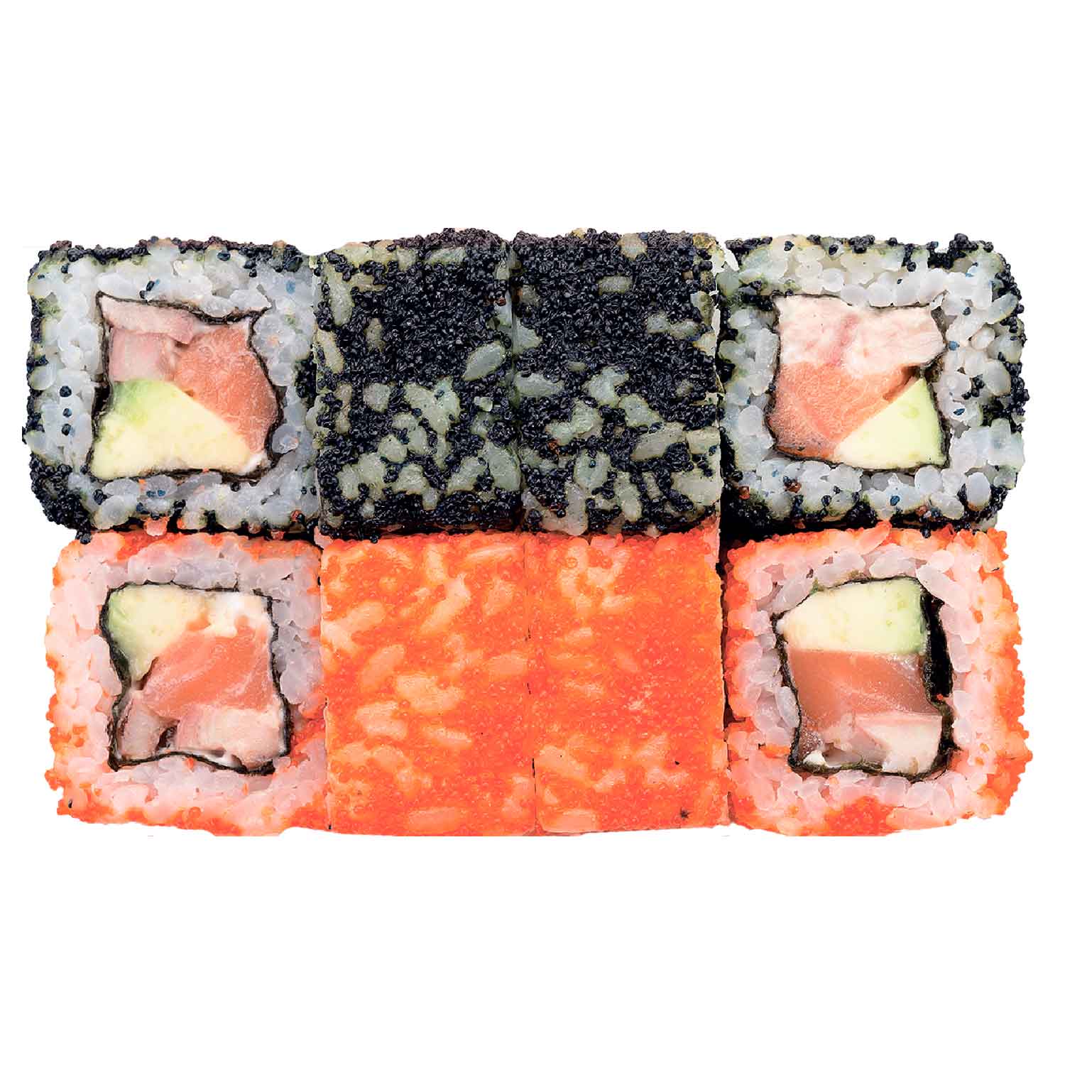авокадо • икра масаго красная • икра масаго черная • лосось • нори • огурец • рис • соус майонез • угорь